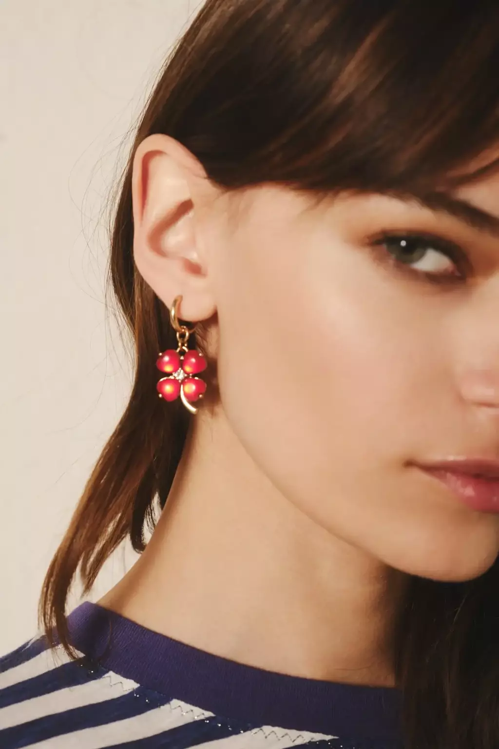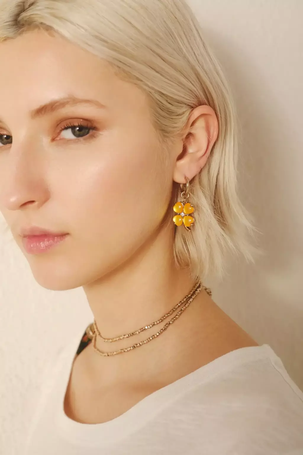 Aros de argollas color dorado, con dije de trébol dorado y resina  con strass plata.