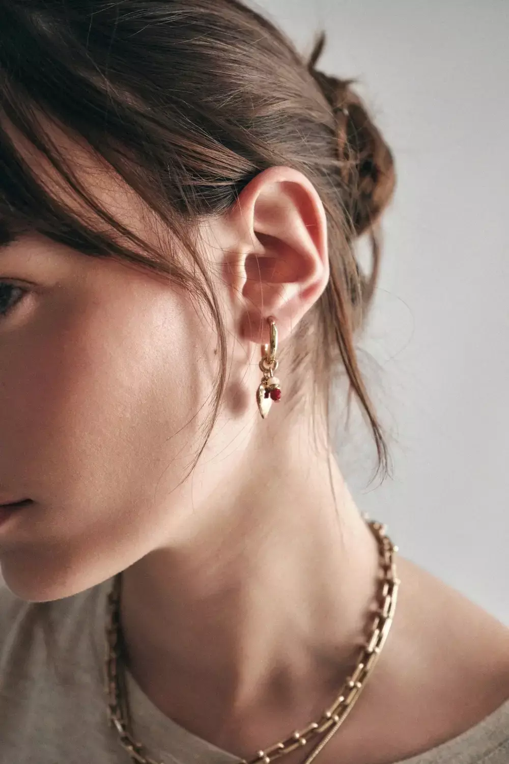 Un par de aros argolla con un dije de corazón en metal y piedras facetadas.
