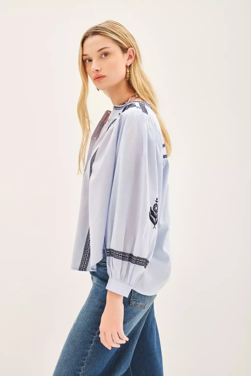 Camisa de fit amplio confeccionada en voile con textura. Posee escote redondo y cartera en el delantero. Tiene bordado a contratono en el frente y en las mangas.
