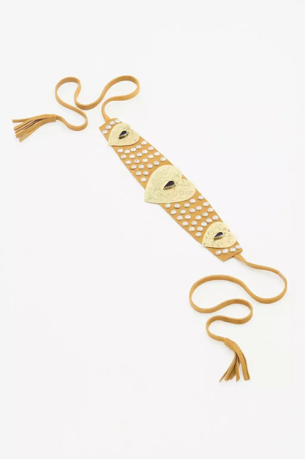 Cinturón faja confeccionado en gamuza, con borlas en los extremos. Cuenta con importantes piezas de corazones grabados con detalle de piedras en forma de gota (al frente y el los laterales) y remaches metálicos con textura en toda la faja. Una pieza única, súper trabajada y original, que suma aires boho y rock a cualquier outfit que acompañe