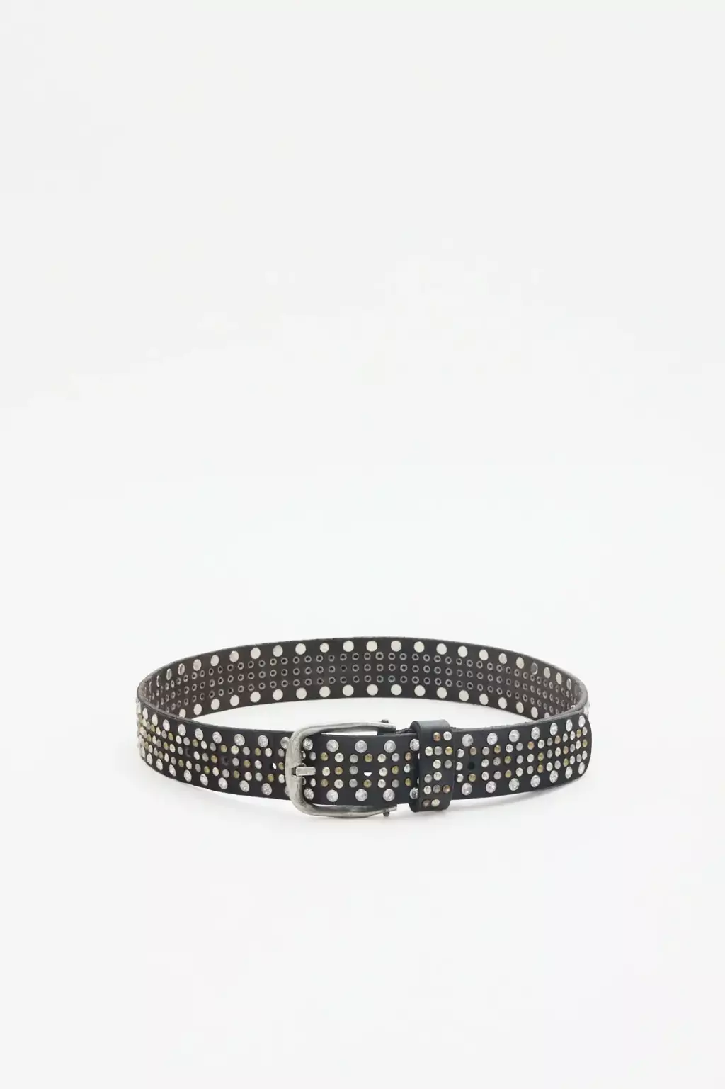 Cinturón de cuero de 4 cm de ancho, con remaches bombée en múltiples baños de metal y símil piedras cristal. Ideal para dar un toque sofisticado a cualquier look.