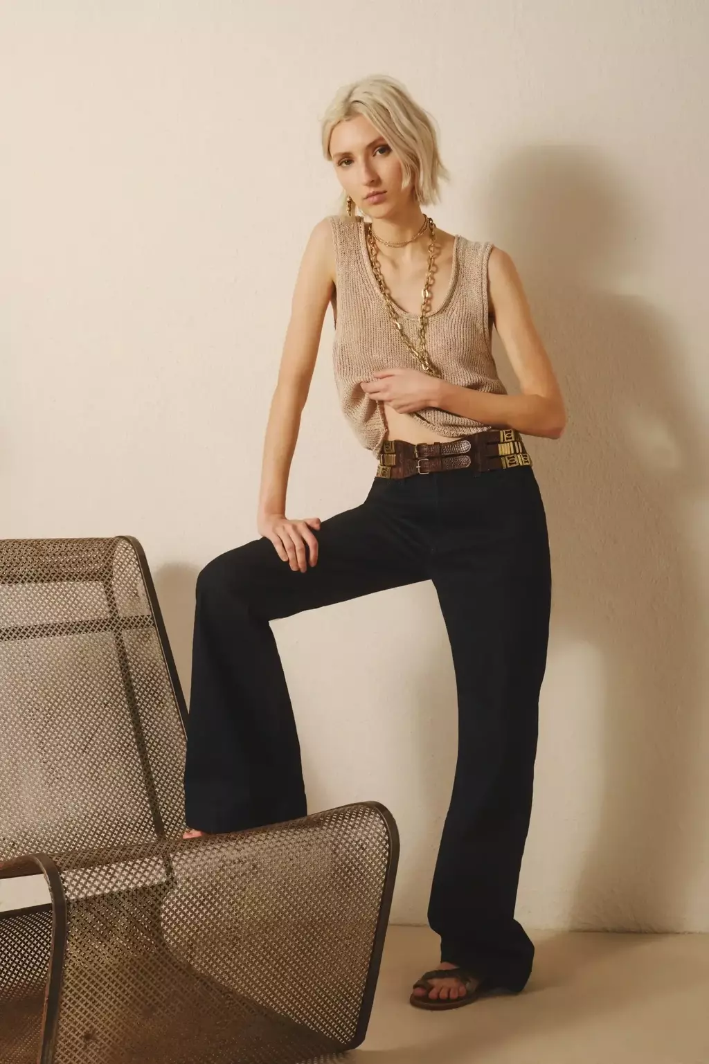 Jean de tiro medio, ajustado de la cintura, la pierna se ensancha sutilmente desde la cadera al ruedo, formando un sutil acampanado. Confeccionado en tejido confort con un poco de elastano, azul oscuro. Lavado raw. En los bolsillos traseros lleva nuestro icónico bordado de alas. Con cierre y botón. Forreria estampada con logo de la marca.