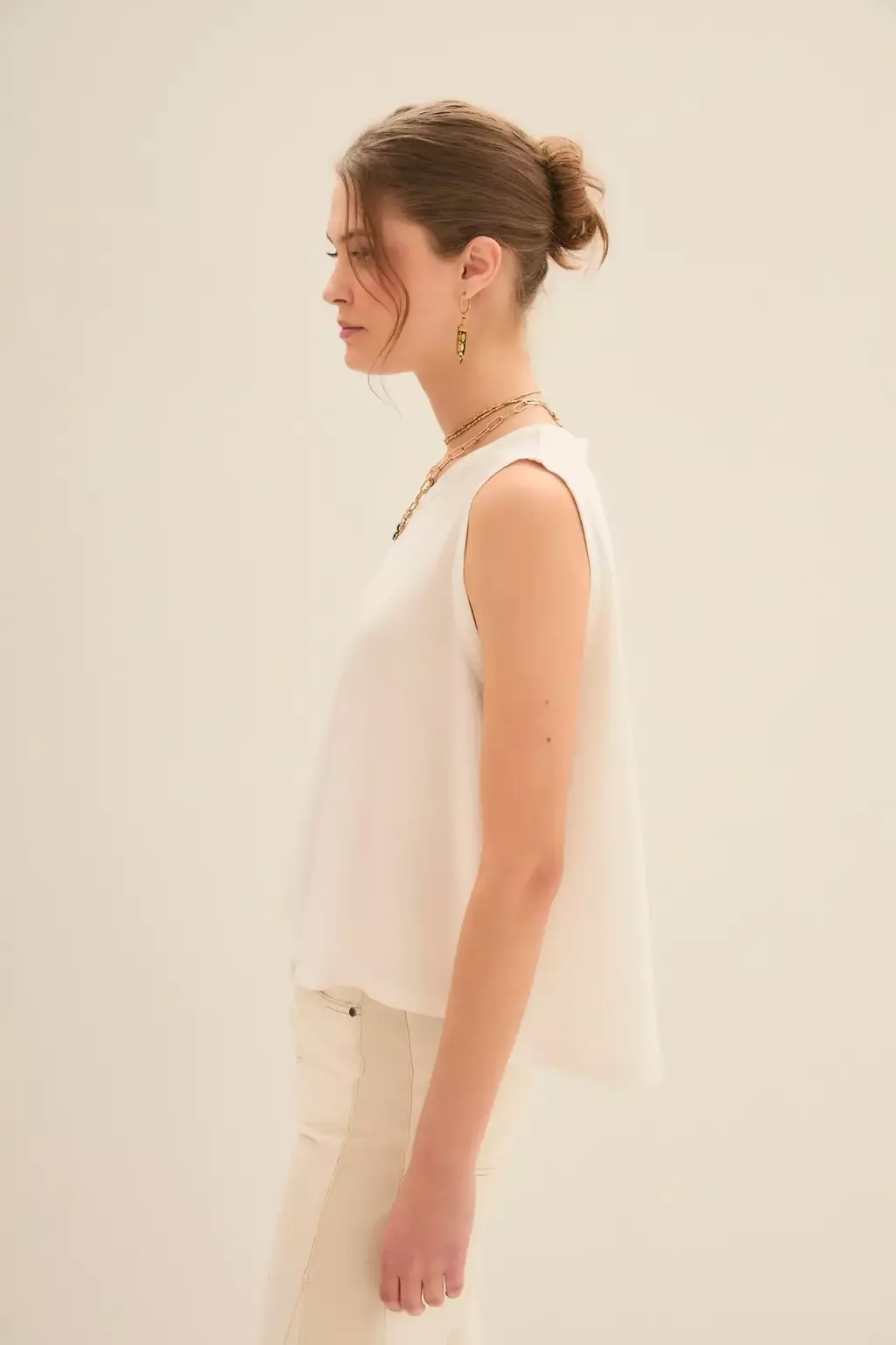 Musculosa básica, de escote cerrado y sisa baja, línea A. Confeccionada en jersey de algodón, suave al tacto. Tiene un calce holgado. En la espada, tiene una medalla marcaria