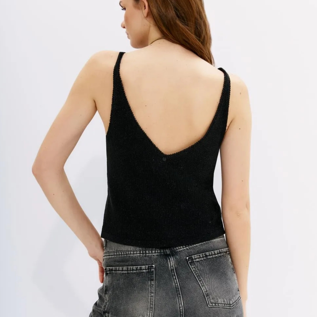 Musculosa tejida en hilo de lurex, con calce fit, al cuerpo, escote en V y espalda baja.