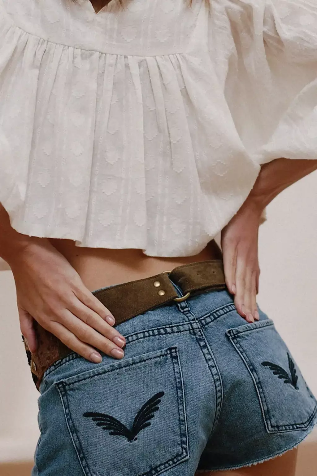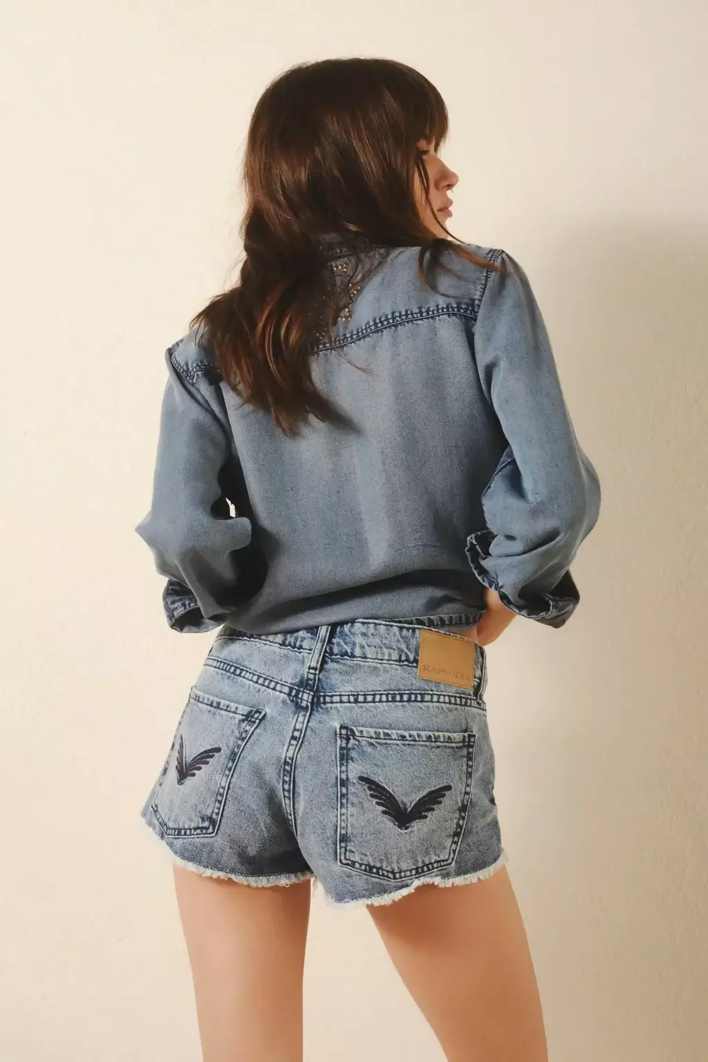 Short de calce tiro medio-bajo, confeccionado en denim rígido azul, con lavado localizado, stones y bigotes. Su ruedo es al corte. En los bolsillos traseros lleva nuestro icónico bordado de alas. Con cierre y botón. Forrería en bolsillos estampada con logo de la marca.