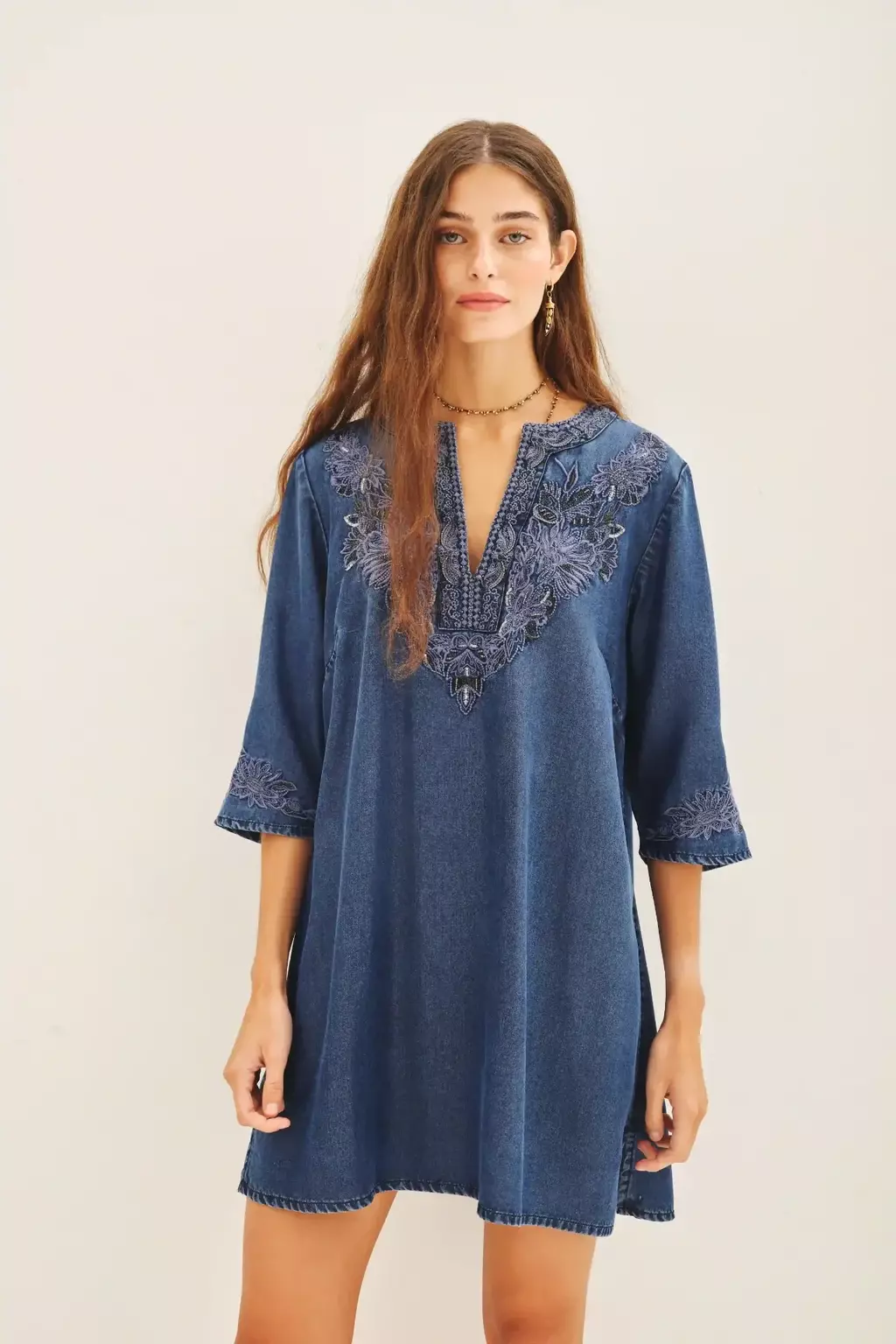 Vestido corto con cuello redondo y escote en V, con mangas al codo. Confeccionado en tencel con bordados hechos en hilos y mostacillas. Hecho en India.