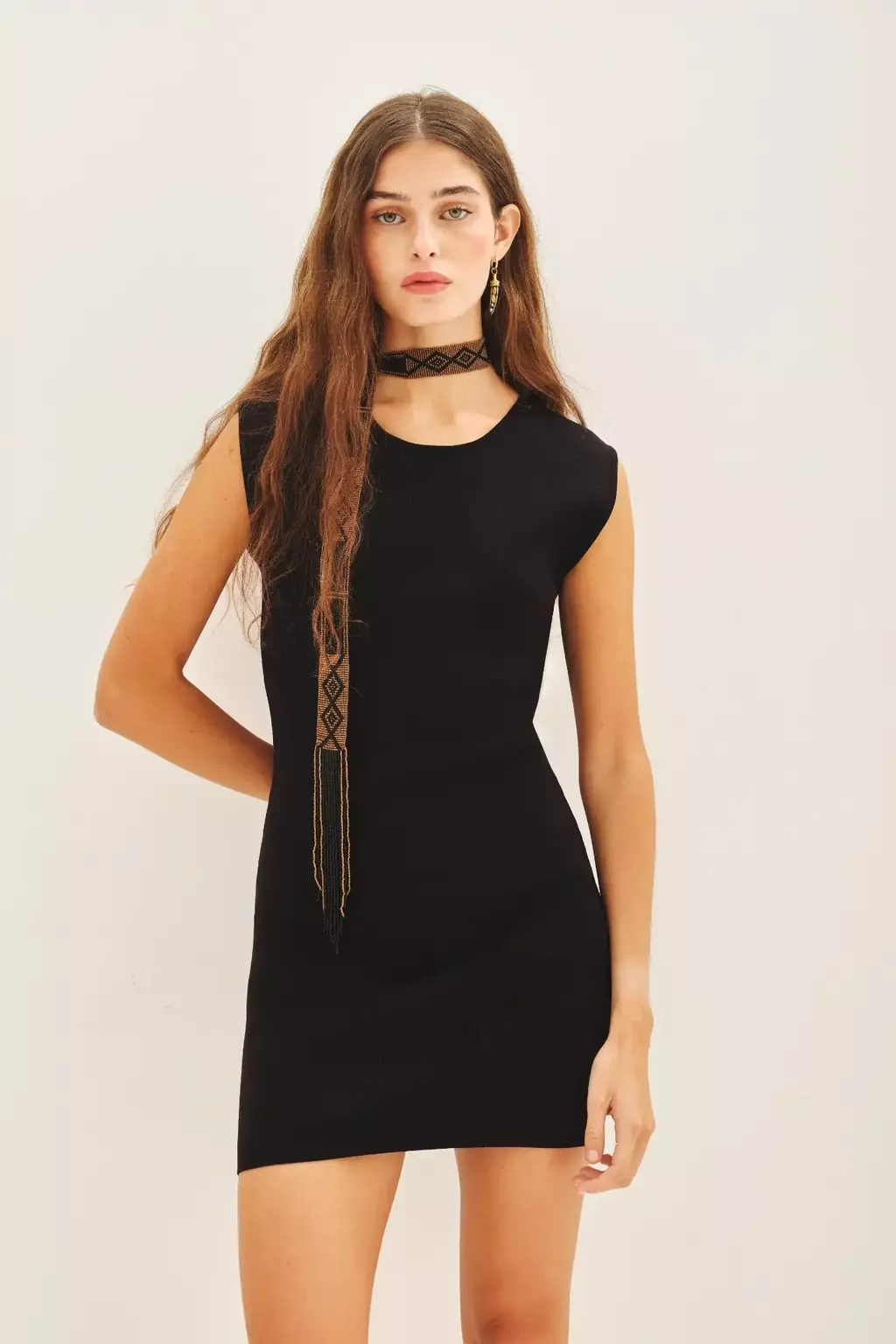 Vestido mini, en tejido compacto, silueta ajustada con hombros destacados, sin manga y espalda baja con sustracción,