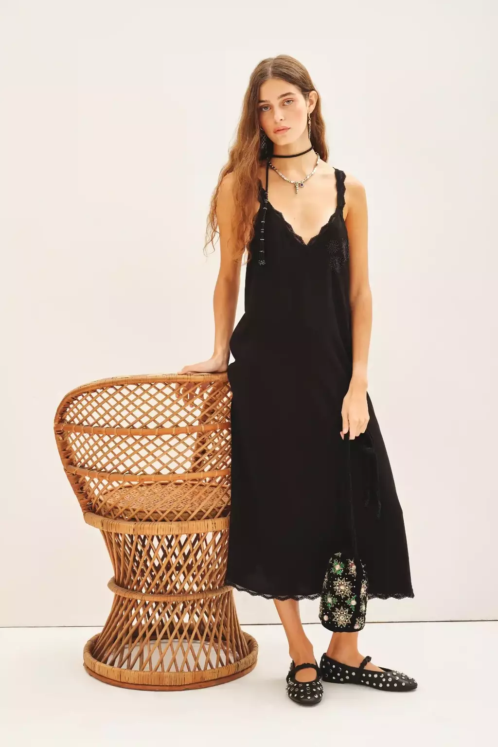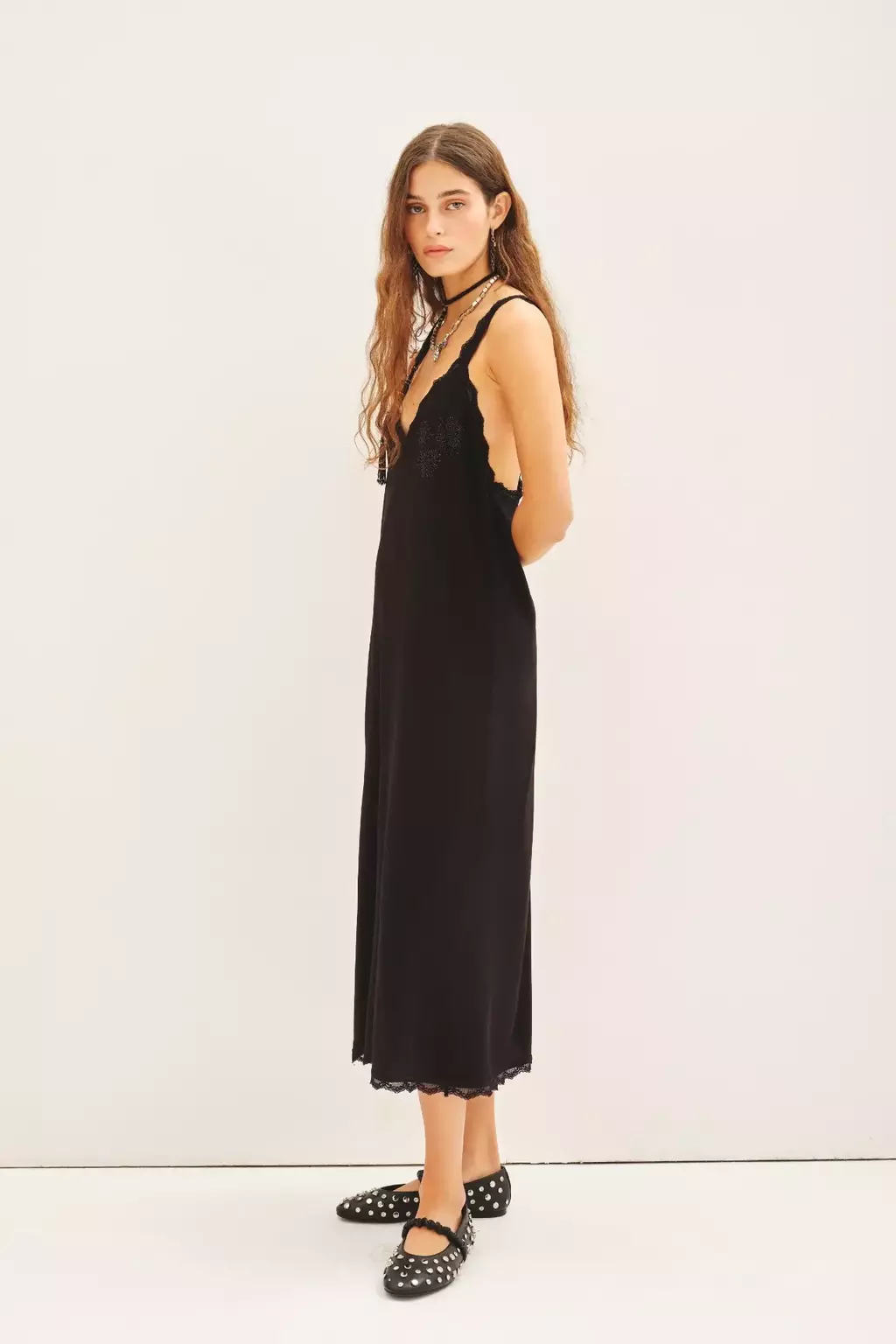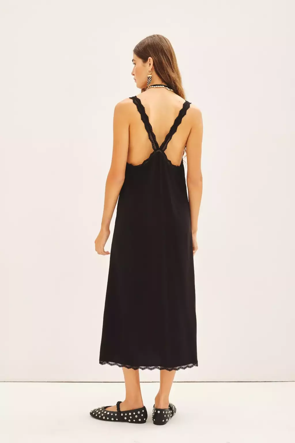 Vestido largo midi, pasando las rodillas. Cuenta con breteles de encaje a tono y detalles de terminación en el mismo encaje. Detalle de tachas termo adhesivas en delantero.