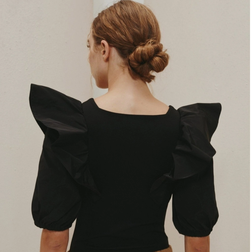 El Body Ivar está confeccionado en una combinación única de Poplin y Punto Roma. Con su toque femenino de volados es perfecta para levantar cualquier pantalón liso o jean. Combinalo con nuestro pantalón Lisboa para lograr una combinación simple pero poderosa.