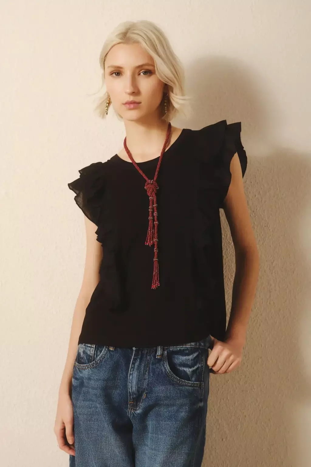 Remera manga corta con combinación de tela de punto y plano. Con detalle de volados en el frente y espalda.